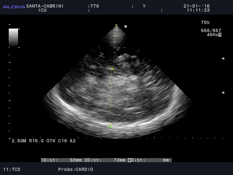 Optic nerve sheath ultrasound (an anatomic assessment) suggested raised ICP. Transcranial Doppler suggested the physiology of raised ICP. 2D grey scale ultrasound imaging of brain demonstrated asymmetry (yes, the team was THAT good). The question: should one stop resuscitation based on CNS POCUS alone?.