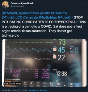 Dr. Cameron Kyle-Sidell is an ED-ICU Doc at Maimonides in New York, currently under the COVID fire. He put up an inflammatory tweet yesterday which caused a lot of different reactions, because it clearly challenged the widespread even if only recent belief that one should intubate the COVID patients quite early, usually much earlier than one would in typical respiratory failure: