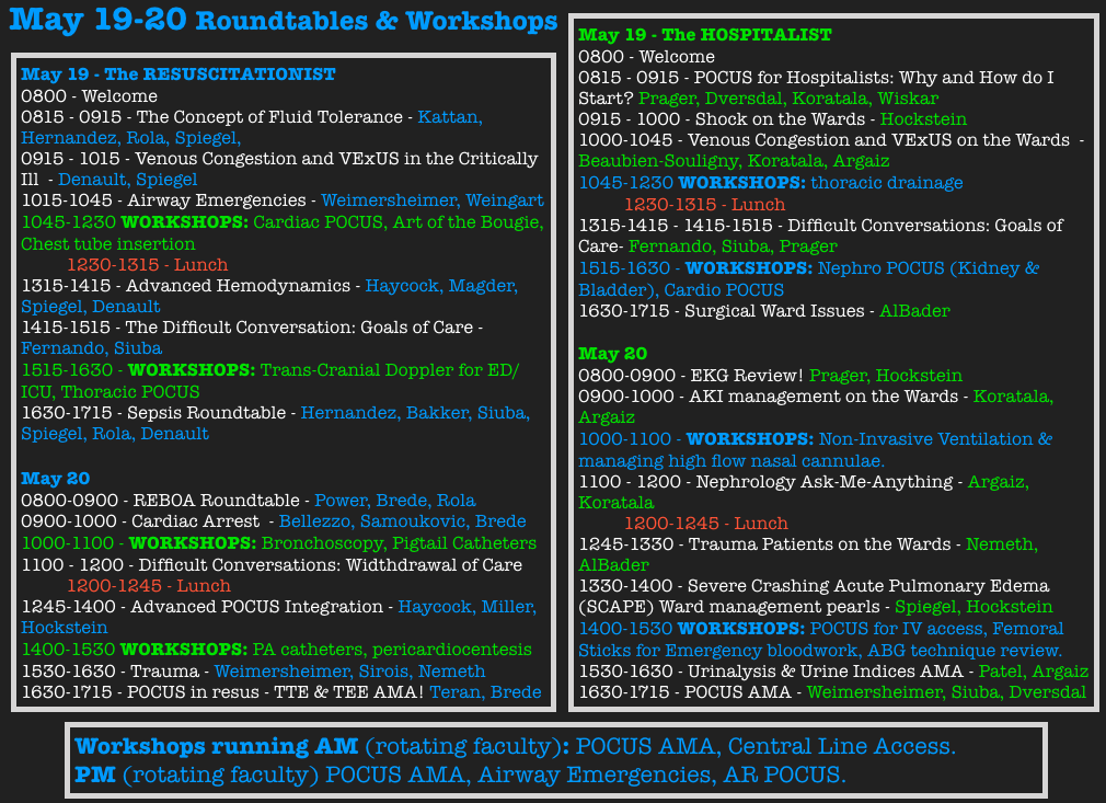 The idea is to maximize the discussion and the workshops, all of whom will be tailored to the different tracks (POCUS, hemodynamics, airway, etc…), so that the participants really get a chance to extract the pearls from the faculty in those two days. Essentially, participants will get double the conference, without having to free up 4 calendar days (unless you plan to attend some of the courses)