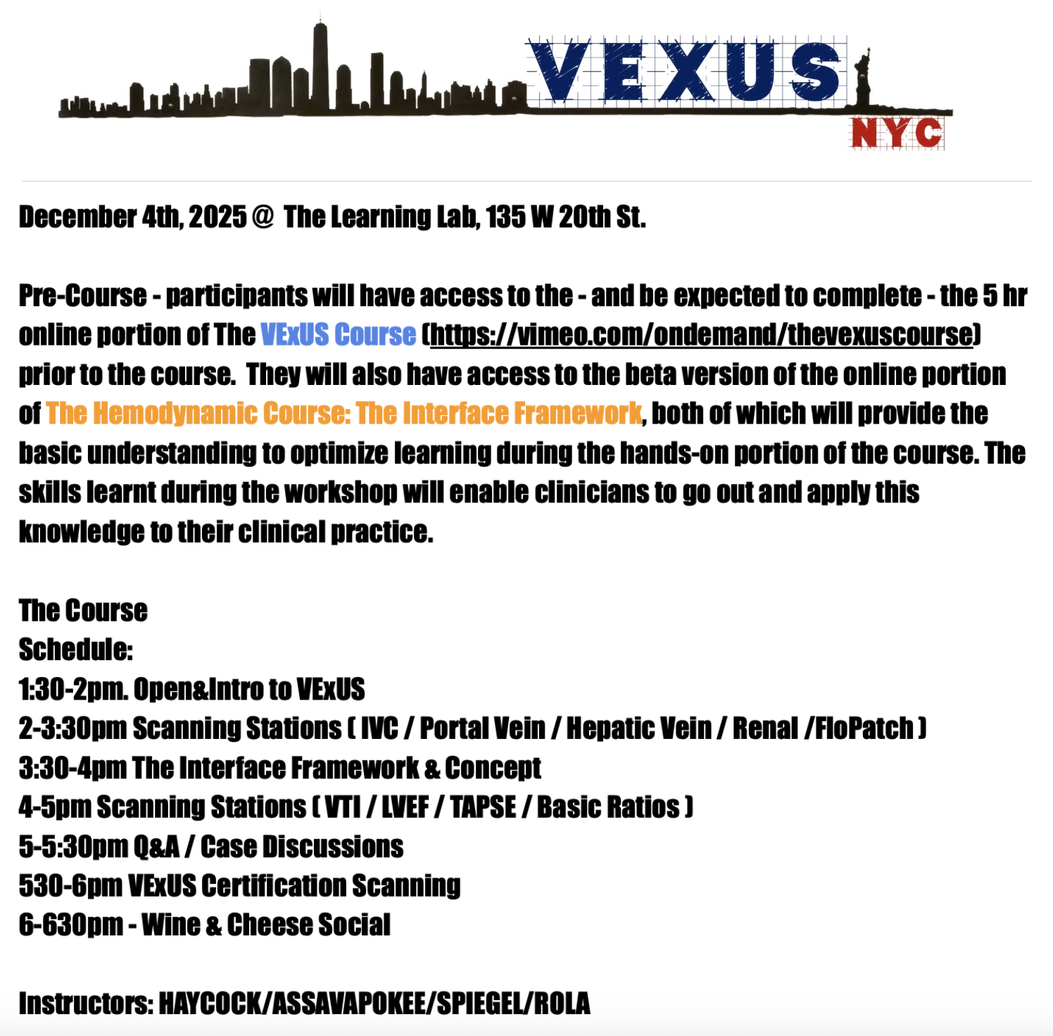We’re super excited about coming to NYC, but even more about unleashing The VExUS Course 2.0, which will include the integration of venous congestion into our comprehensive hemodynamic interface framework. So participants will have an all-new version of the course, along with an introduction to the interface concept which is gaining a lot of traction, and (of course we are biased) we feel is the way forward in assessing and managing any hemodynamic issue. So this will be 4 hours of hands-on workshop and case discussion. We will also introduce participants to the use of the FlowPatch, a Doppler system for the neck veins that assesses both forward flow and congestion, and fits very well into the interface system. This course is for those who believe (as we do) that tailoring treatment to the individual patient’s pathophysiology is the way forward. Participants will leave having levelled up.