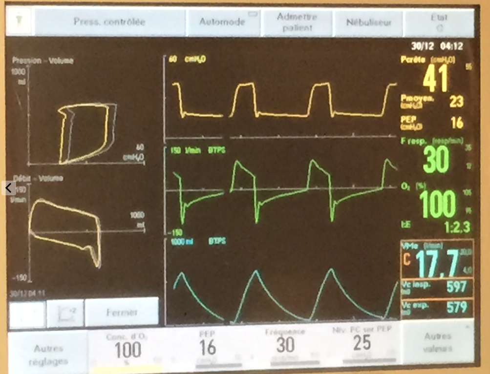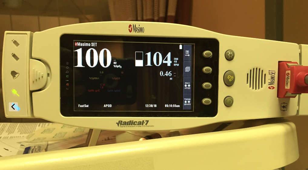 So now the sat finally starts to record in the low 60’s. We have a PEEP of 5, so start bringing it up. We hit 16 before the BP starts to drop, and that only gets us to the mid 70’s sat%. She actually squeezes my hand to command.