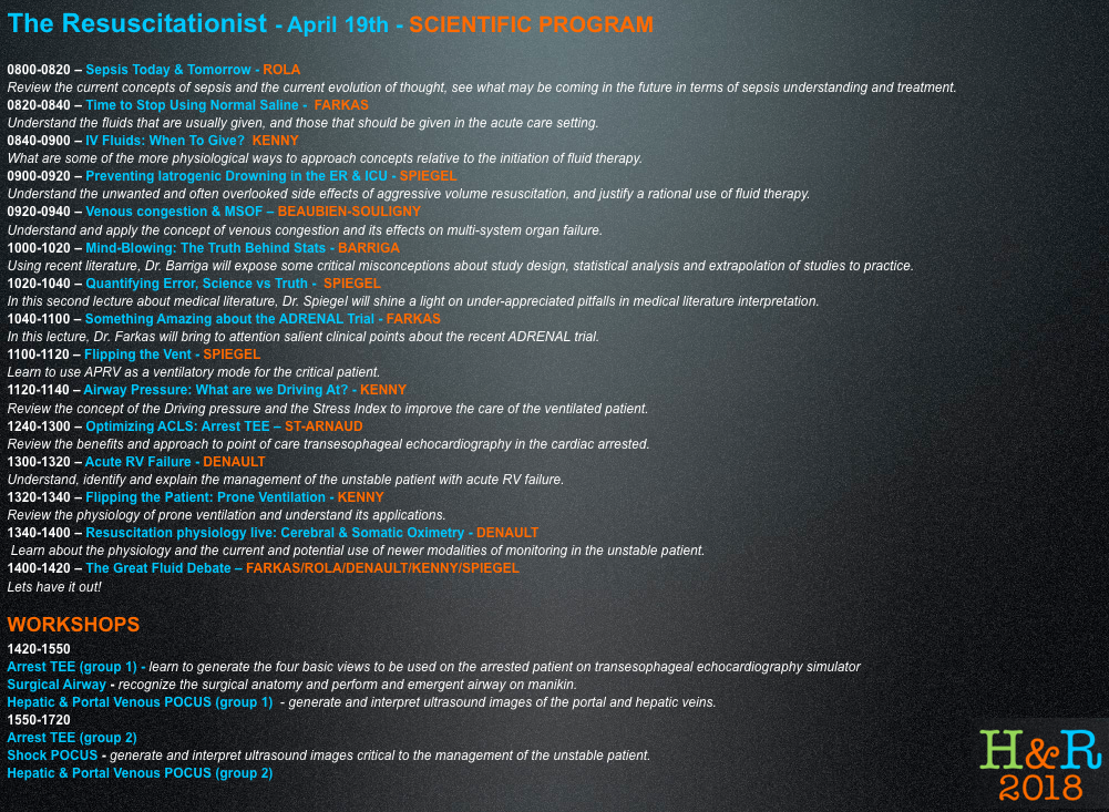 So, who will be talking?  The lineup already includes Andre Denault, Josh Farkas (@Pulmcrit), Jon-Emile Kenny (@heart_lung), Rory Spiegel (@EMnerd), Hussein Fadlallah, Peter Barriga, Daniel Kaud, Davide Maggio, Michael Palumbo, William Beaubien-Souligny, and a few more to confirm. And who knows who might do an impromptu drop-in…